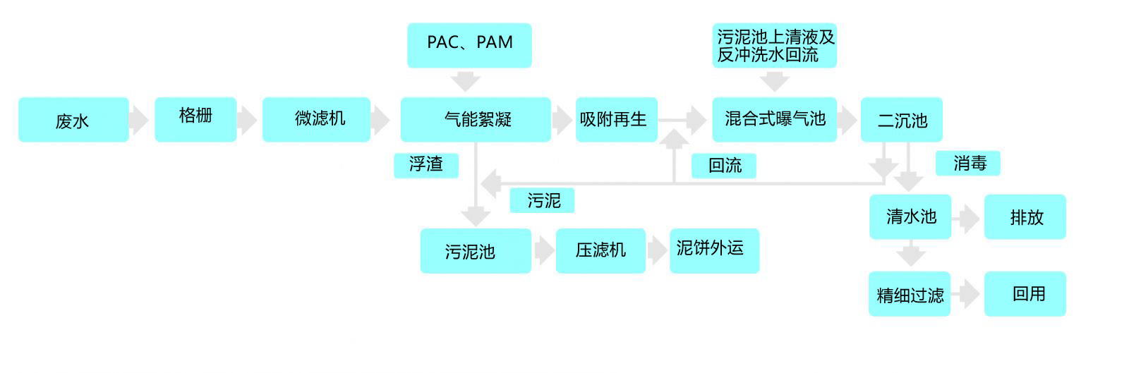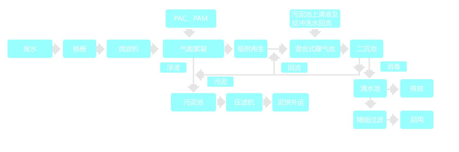氣能絮凝系統(tǒng)的浮渣與二沉池的剩余污泥收集于污泥池,濃縮后通過壓濾機(jī)脫水后外運(yùn)。