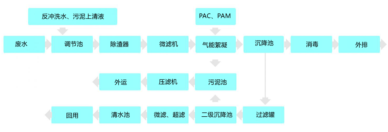 廢水首先進(jìn)入調(diào)節(jié)池進(jìn)行水質(zhì)、水量調(diào)節(jié),提升后進(jìn)入兩級高濃除渣器去除廢水中的顆粒雜質(zhì),然后經(jīng)微濾機(jī)收集廢水中相對細(xì)小的棉渣回用,為后續(xù)處理工藝減輕負(fù)荷。出水經(jīng)泵提升至氣能絮凝系統(tǒng)加藥(PAM與PAC)混合后去除原水中所含的大量膠質(zhì),出水到沉降池,上清液經(jīng)消毒后可達(dá)標(biāo)外排。如中水回用,則提升至多級精細(xì)過濾系統(tǒng)過濾后進(jìn)入中間水池,經(jīng)超濾系統(tǒng)處理后回用。