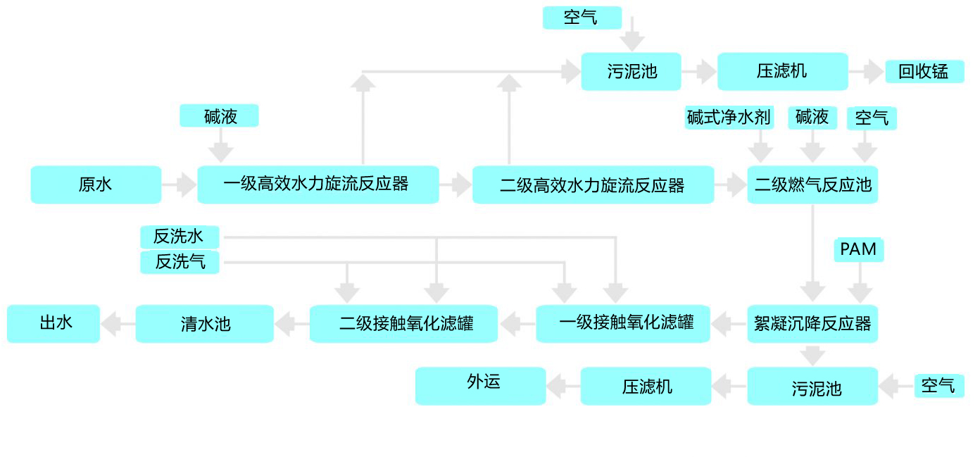 原水進入兩級高效水力旋流反應(yīng)器,在進水管道前投加藥劑調(diào)節(jié)PH值,在反應(yīng)器內(nèi)形成初級懸浮態(tài)水合錳氧化物,并在錐形分離區(qū)初步實現(xiàn)固液分離,上清液進一步調(diào)節(jié)pH,充分曝氣后,水中殘余的錳離子轉(zhuǎn)化成水合MnO2及Mn(OH)2,在絮凝沉降反應(yīng)系統(tǒng)內(nèi)再次固液分離。出水經(jīng)二級“活性濾膜”自催化系統(tǒng)精細過濾,達到設(shè)計標(biāo)準(zhǔn)(錳≤2mg/L、鐵≤1mg/L)。
