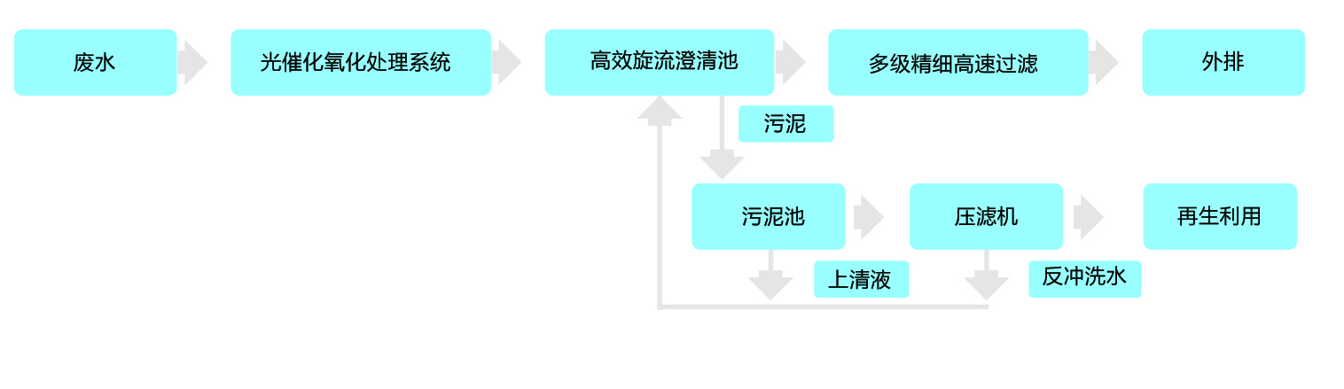 油田采油回注水進(jìn)入光催化氧化處理系統(tǒng),利用光催化改性陶瓷介質(zhì)作為載體,以可見光為光源,提高活性極強(qiáng)的羥基自由基的產(chǎn)率,通過羥基自由基與廢水中有機(jī)物的加成、取代、電子轉(zhuǎn)移等反應(yīng)使大部分有機(jī)污染物礦化為二氧化碳、水等簡單無機(jī)物。出水再進(jìn)入高效旋流澄清池,投加改性淀粉絮凝劑,使池中形成活性油渣層,強(qiáng)化廢水中細(xì)小油粒與活性油渣層內(nèi)較大油滴的接觸絮凝過程,從而高效除油。同時(shí)在裝置進(jìn)水區(qū)設(shè)計(jì)出獨(dú)特的喉管混合結(jié)構(gòu),使池中形成小而密實(shí)的絮凝體,提高旋流澄清池的絮凝效率。出水經(jīng)輻射式多級精細(xì)高速過濾器處理后可達(dá)標(biāo)外排。